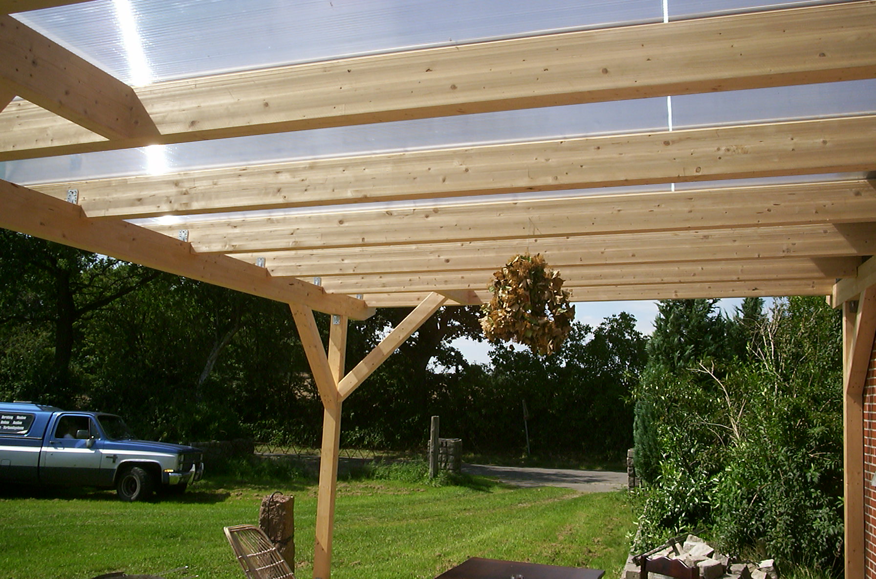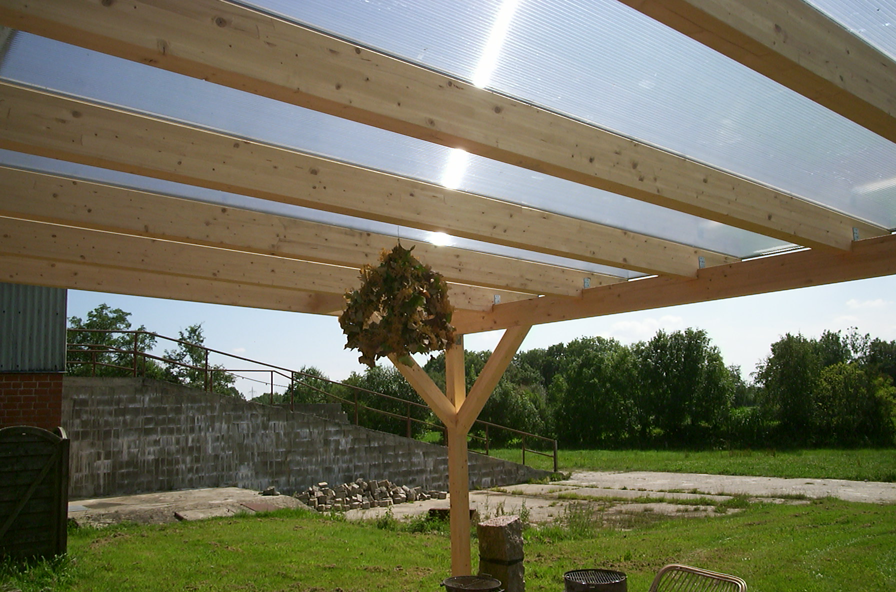 Die Holzkonstruktion besteht ausschließlich aus Leimhölzern in verschiedenen Schnittgrößen. Die Dacheindeckung besteht aus einem Dreifachstegplattensystem welches äußerst widerstandsfähig gegen Witterungseinflüsse ist.